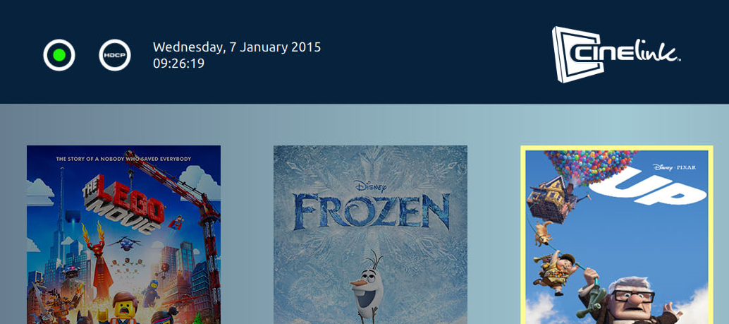 This procedure clears the Cinelink's stored display information (also called EDID). As the device re-starts, it will collect new information from the attached displays. When the Cinelink boots up fully, you should now see a normal HDCP indicator in the upper left area of the screen. The device should allow you to play a movie normally with no errors.