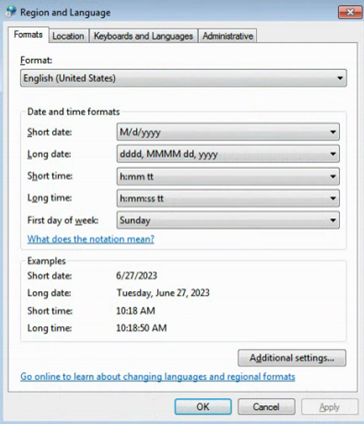- Confirm the server Region is set to English(United States) 12 hour format as shown below.