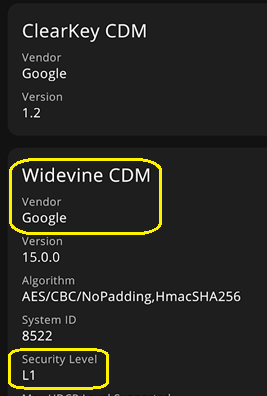 As you can see in this image, this device supports Widevine Level 1 DRM. There are three Widevine DRM levels.