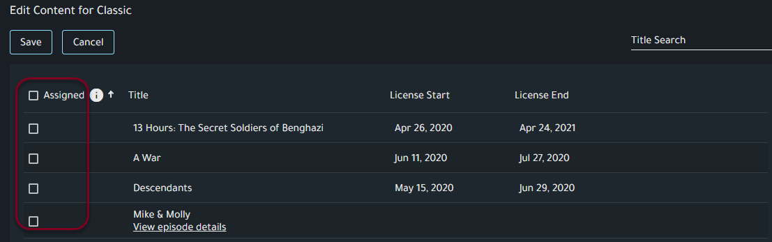 - Click the Assigned box next to any title(s) or television episodes to include them in the category