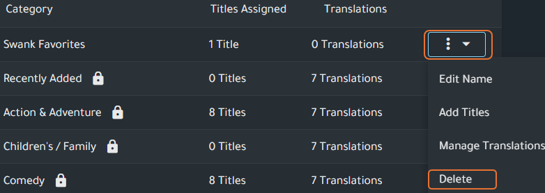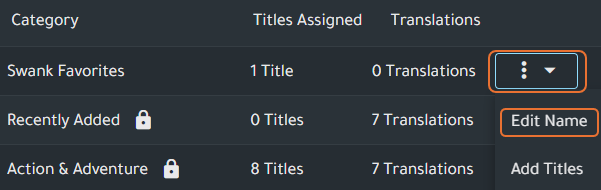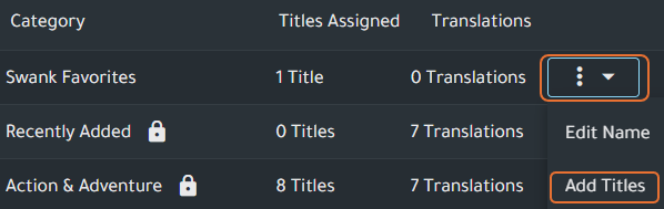 - Locate the category either by using search or scrolling through the list in the Category Manager and click the overflow menu and select Add Titles