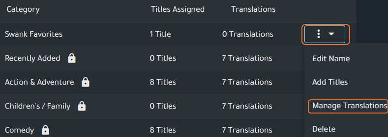 - Locate the category either by using search or scrolling through the list in the Category Manager, select the overflow menu, and click Manage Translations